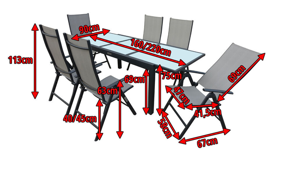 Diese Villana Esstischgruppe bietet Platz für sechs Personen - perfekt, um mit Freunden, Familie oder Nachbarn gemütlich im Garten oder auf der Terrasse zu sitzen. Die Gruppe setzt sich aus einem ausziehbaren Gartentisch und sechs Klappstühlen zusammen, auf Wunsch können Sie diese Gruppe auch noch mit passenden Artikeln der Villana Serie erweitern. Der Tisch ist ca. 90 cm breit und ca. 75 cm hoch, im normalen Zustand hat er eine Länge von ca. 160 cm, so sind Sie sowohl für ein gemütliches Mittagessen mit der Familie als auch für die große Gartenparty bestens ausgerüstet. Das pulverbeschichtete Aluminiumgestell des Tisches kommt in einem attraktiven Anthrazit daher, die ca. 5 mm dicke Tischplatte aus Sicherheitsglas ist weiß. Die Platte zum Erweitern des Tisches ist ebenfalls aus ca. 5 mm dickem Sicherheitsglas gefertigt und lässt sich durch einen Flügelmechanismus ausklappen. Man zieht einfach die beiden oberen Platten auseinander und klappt die darunterliegende Platte nach oben, und schon ist der Tisch auf ca. 220 cm erweitert. Der Sessel verfügt ebenfalls über ein anthrazitfarben pulverbeschichtetes Aluminiumgestell, auf welches ein formstabiles Textil-Gewebe 2x1 (70% Polyvinylchlorid / 30% Polyester) in Grau aufgespannt wurde. Mit Maßen von ca. 67 x 58 x 113 cm und einem Gewicht von nur ca. 4,3 kg lässt sich der Stuhl ganz leicht hin und her stellen. Gleichzeitig bietet er die nötige Stabilität und einen angenehmen Sitzkomfort, denn dieser Sessel ist wirklich ein Verwandlungskünstler. Er bietet seinem Nutzer neun verschiedene Einstellungen der Rückenlehne. So ist für jede Situation die richtige Liege- oder Sitzeinstellung dabei - ob beim Essen mit Freunden oder Familie, beim Lesen eines Buches oder beim Sonnenbaden. Bei Nichtgebrauch lassen sich die Stühle ganz leicht zusammenklappen und nehmen so sehr wenig Platz ein. Mit einer Belastbarkeit von bis zu ca. 130 kg ist der praktische Sessel besonders robust und für erholsame Stunden in der Sonne einsatzbereit. Die Fußkappen der Möbel sind aus schwarzem Kunststoff und schützen den Boden vor unschönen Kratzern beim Verrücken des Stuhles, die silbernen Schrauben aus galvanisiertem Stahl runden die Optik perfekt ab.