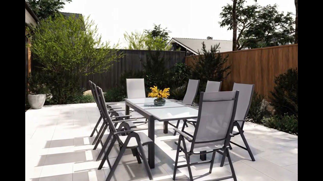 Diese Villana Esstischgruppe bietet Platz für acht Personen - perfekt, um mit Freunden, Familie oder Nachbarn gemütlich im Garten oder auf der Terrasse zu sitzen. Die Gruppe setzt sich aus einem ausziehbaren Gartentisch und acht Klappstühlen zusammen, auf Wunsch können Sie diese Gruppe auch noch mit passenden Artikeln der Villana Serie erweitern. Der Tisch ist ca. 90 cm breit und ca. 75 cm hoch, im normalen Zustand hat er eine Länge von ca. 160 cm, so sind Sie sowohl für ein gemütliches Mittagessen mit der Familie als auch für die große Gartenparty bestens ausgerüstet. Das pulverbeschichtete Aluminiumgestell des Tisches kommt in einem attraktiven Anthrazit daher, die ca. 5 mm dicke Tischplatte aus Sicherheitsglas ist weiß. Die Platte zum Erweitern des Tisches ist ebenfalls aus ca. 5 mm dickem Sicherheitsglas gefertigt und lässt sich durch einen Flügelmechanismus ausklappen. Man zieht einfach die beiden oberen Platten auseinander und klappt die darunterliegende Platte nach oben, und schon ist der Tisch auf ca. 220 cm erweitert. Der Sessel verfügt ebenfalls über ein anthrazitfarben pulverbeschichtetes Aluminiumgestell, auf welches ein formstabiles Textil-Gewebe 2x1 (70% Polyvinylchlorid / 30% Polyester) in Grau aufgespannt wurde. Mit Maßen von ca. 67 x 58 x 113 cm und einem Gewicht von nur ca. 4,3 kg lässt sich der Stuhl ganz leicht hin und her stellen. Gleichzeitig bietet er die nötige Stabilität und einen angenehmen Sitzkomfort, denn dieser Sessel ist wirklich ein Verwandlungskünstler. Er bietet seinem Nutzer neun verschiedene Einstellungen der Rückenlehne. So ist für jede Situation die richtige Liege- oder Sitzeinstellung dabei - ob beim Essen mit Freunden oder Familie, beim Lesen eines Buches oder beim Sonnenbaden. Bei Nichtgebrauch lassen sich die Stühle ganz leicht zusammenklappen und nehmen so sehr wenig Platz ein. Mit einer Belastbarkeit von bis zu ca. 130 kg ist der praktische Sessel besonders robust und für erholsame Stunden in der Sonne einsatzbereit. Die Fußkappen der Möbel sind aus schwarzem Kunststoff und schützen den Boden vor unschönen Kratzern beim Verrücken des Stuhles, die silbernen Schrauben aus galvanisiertem Stahl runden die Optik perfekt ab.