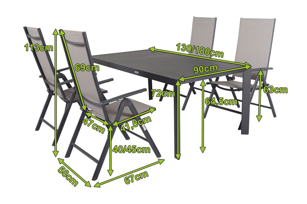 Diese Esstischgarnitur besteht aus 4 bequemen Sesseln und einem Ausziehtisch - perfekt, für eine kleine Runde aus Freunden, Familie oder Nachbarn. Bei Bedarf können Sie diese Gruppe mit passenden Artikeln der VILLANA Serie erweitern. Der optisch zeitlose Esstisch ist rein aus Aluminium gefertigt und besitzt eine Pulverbeschichtung in der Farbe Anthrazit. Aluminium ist ein gern verwendetes Material im Gartenmöbelsektor, da es besonders leicht, zeitgleich jedoch sehr stabil ist. Dazu kommt der geringe Pflegeaufwand durch die Pulverbeschichtung. Die meisten Verschmutzungen lassen sich unkompliziert mit Wasser aufweichen und anschließend abspülen oder mit einem weichen Schwamm entfernen. Zusammengefahren hat der Tisch bereits eine Größe von ca. 130 x 90 x 72 cm. Dabei hat der Tisch stets eine Unterkantenhöhe von ca. 68 cm - so können Sie die Stühle problemlos unter die Tischplatte schieben. Um die volle Größe des Tisches zu erhalten, ziehen Sie den Tisch einfach an der Auszugsseite aus. Unter der oberen Tischplatte kommt die Einlage zur Verlängerung der Tischplatte zum Vorschein. Diese müssen Sie manuell herausnehmen und auf das Gestell der Tischplatte legen. Letzlich werden durch das Zusammenschieben von Tischgestell und Einlegeplatte die Pins in die dafür vorgesehenen Löcher geschoben und es entsteht ein insgesamt größerer Tisch. Der ausgezogene Tisch weist nun eine Gesamtlänge von ca. 180 cm auf. Den Mechanismus finden Sie auch in der Bildergalerie des Sets. Der Clou: Im Gegensatz zu anderen Ausziehtischen haben Sie hier keine freischwebende Tischplatte, sondern die Tischplatte liegt bündig auf dem Untergestell auf. Die ca. 2 cm dicke Tischplatte bildet ein zuverlässiges Element des Tisches. Durch die geschickte Verarbeitung besitzt das Gestell eine besonders hohe Stabilität und dank des Gewichtes von ca. 22,7 kg ist der Tisch bis ca. 50 kg belastbar. Mit der Tischunterkante in Höhe von ca. 64,5 cm lassen sich die Stühle problemlos unter die Tischplatte schieben.