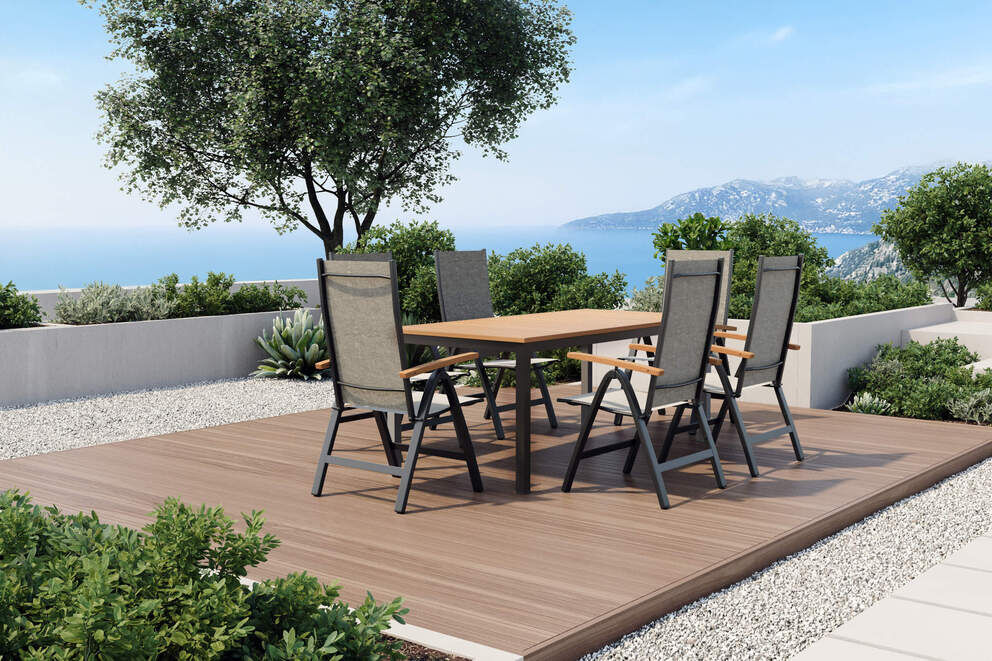 Die Kombination aus Aluminium, Eukalyptusholz und Textilgewebe sorgt für eine edle Optik und angenehme Haptik. Während das Aluminiumgestell für Stabilität sorgt, bietet das atmungsaktive Textilgewebe einen hohen Sitzkomfort und die natürliche Holzmaserung der Tischplatte verleiht dem Set eine warme, einladende Atmosphäre.  |
