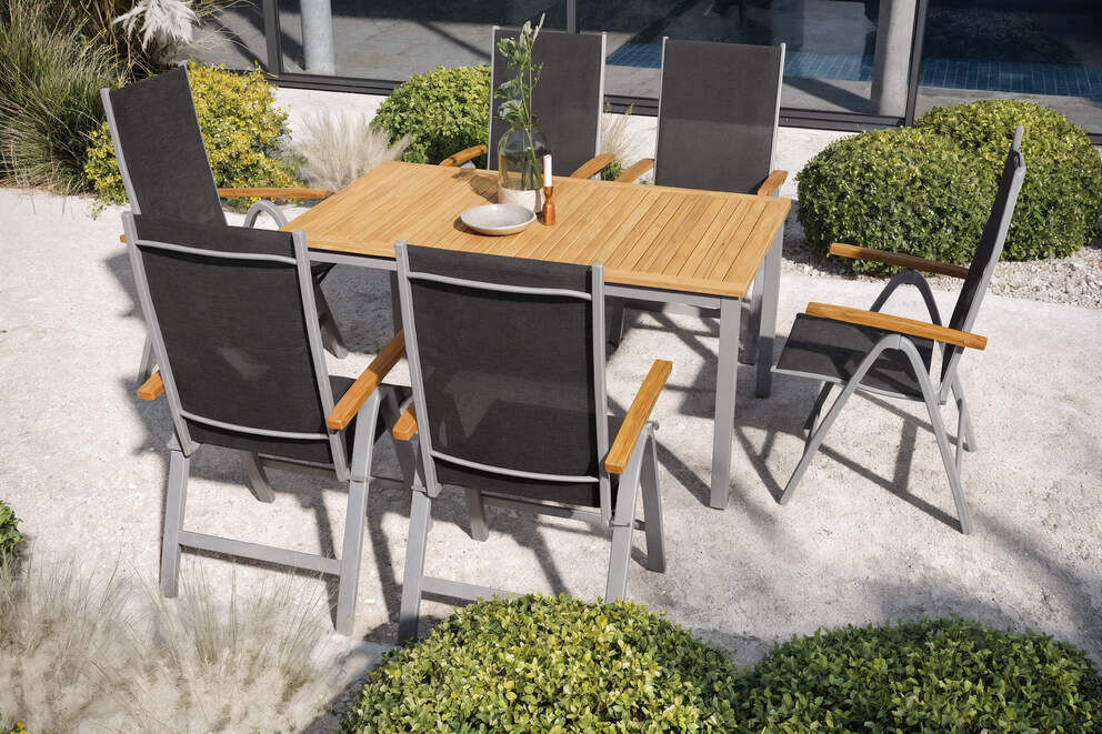 Die sechs ergonomisch gestalteten Klappstühle überzeugen mit einem rostfreien Aluminiumgestell und einer strapazierfähigen Textilene-Bespannung in Silber. Die atmungsaktive Bespannung sorgt selbst an heißen Sommertagen für höchsten Sitzkomfort. Die höhenverstellbaren Rückenlehnen bieten individuelle Anpassungsmöglichkeiten, während die natürlichen Armlehnen aus Eukalyptusholz das Design harmonisch abrunden. Die Klappfunktion der Stühle ermöglicht eine platzsparende Lagerung und macht sie besonders praktisch im Alltag.