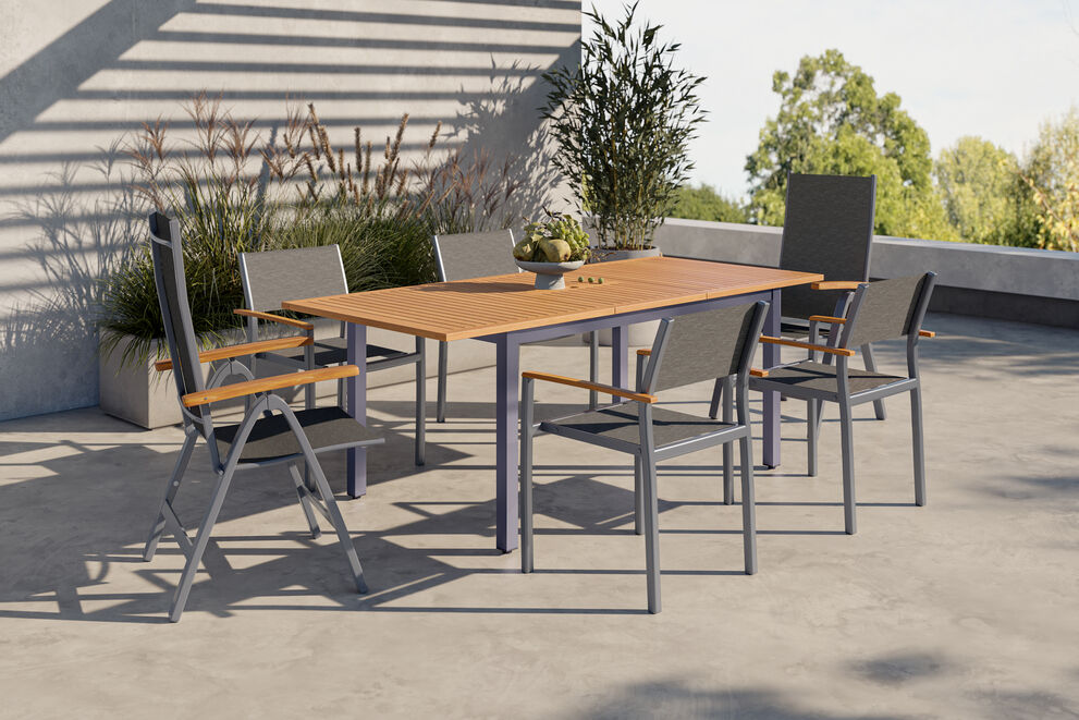 Der ausziehbare Tisch bildet das Herzstück dieser Essgruppe. Mit einer Länge von ca. 150/200 cm und einer Breite von ca. 90 cm bietet er ausreichend Platz für bis zu sechs Personen. Das hochwertige Aluminiumgestell in Schwarz ist nicht nur stabil, sondern auch korrosionsbeständig und wetterfest. Die Tischplatte aus Eukalyptusholz verleiht dem Tisch eine warme, natürliche Ausstrahlung und fügt sich nahtlos in jede Outdoor-Einrichtung ein. Dank der ausziehbaren Funktion lässt sich der Tisch im Handumdrehen an Ihre Bedürfnisse anpassen – ob für ein gemütliches Frühstück zu zweit oder ein großes Abendessen mit Gästen.