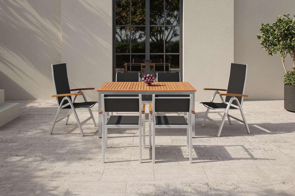 Die gesamte Garten-Essgruppe ist auf maximale Langlebigkeit ausgelegt. Korrosionsbeständige Materialien wie Aluminium und die strapazierfähige Textilene-Bespannung garantieren eine hohe Belastbarkeit und Witterungsbeständigkeit. So bleibt Ihre Essgruppe über viele Jahre hinweg ein zuverlässiger Begleiter im Garten oder auf der Terrasse. Darüber hinaus erleichtert die pflegeleichte Konstruktion die Reinigung und sorgt für einen dauerhaft gepflegten Eindruck.