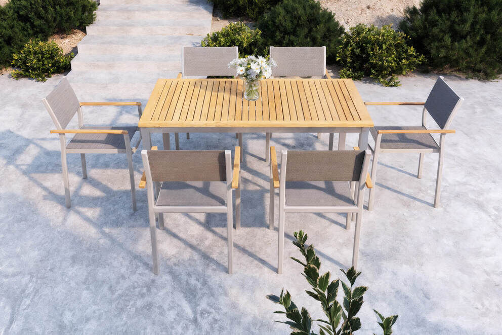 Die sechs dazugehörigen Stapelstühle sind nicht nur bequem, sondern auch besonders praktisch. Mit ihrer eleganten Kombination aus Aluminiumgestell und Eukalyptusholz-Armlehnen bieten die Stühle eine hohe Stabilität und einen hohen Sitzkomfort. Die Textilene-Sitzflächen und Rückenlehnen sind besonders strapazierfähig und bieten auch bei längeren Sitzungen angenehmen Komfort. Die Stühle sind stapelbar, was eine platzsparende Aufbewahrung ermöglicht, wenn sie nicht in Gebrauch sind. So bleibt Ihr Außenbereich immer ordentlich und aufgeräumt.