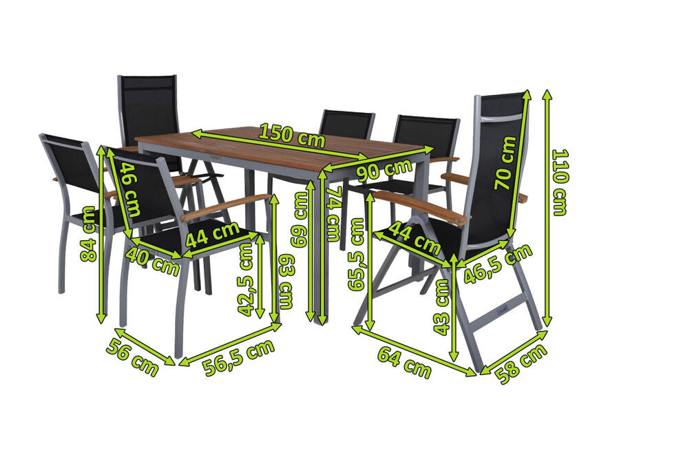 Diese Villana Esstischgruppe bietet genügend Platz für sechs Personen und besitzt auch in Sachen Komfort und Verarbeitung nur die beste Qualität. Die Farb- und Materialkombination aus Silber, Schwarz, Aluminium, Textilene und FSC-Akazienholz sorgt für eine rustikale Eleganz, welche die vielfältige Kombination mit anderen Möbelstücken oder Dekoration ermöglicht. Der Gartentisch bietet Ihnen mit einer Länge von ca. 150 cm und einer Breite von ca. 90 cm genügend Platz, um reichlich bestückt zu werden. Mit seiner Höhe von ca. 74 cm besitzt dieser Tisch eine ideale Wohlfühlhöhe. Der Tisch wiegt ca. 17 kg und die Tischplatte weist neben einem neuen Design, eine verbesserte Stabilität auf. Die Tischplatte ist ca. 20 mm dick. Das hochwertige Aluminiumgestell wurde sowohl bei dem Esstisch als auch bei den Stühlen pulverbeschichtet und kommt in einem eleganten Silber daher. Die Pulverbeschichtung sorgt für längere Haltbarkeit und Witterungsbeständigkeit.