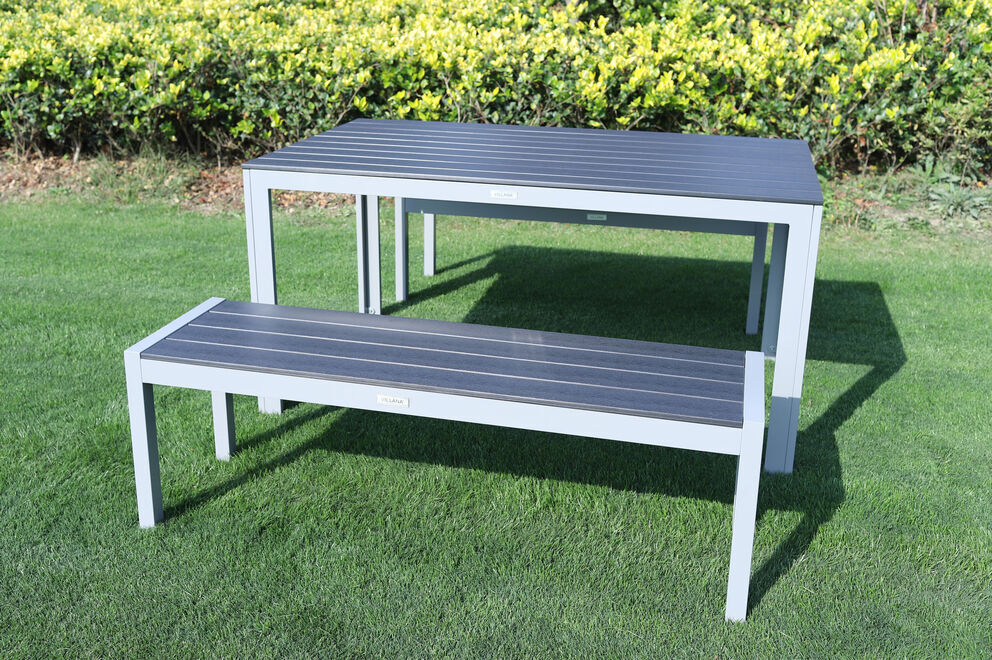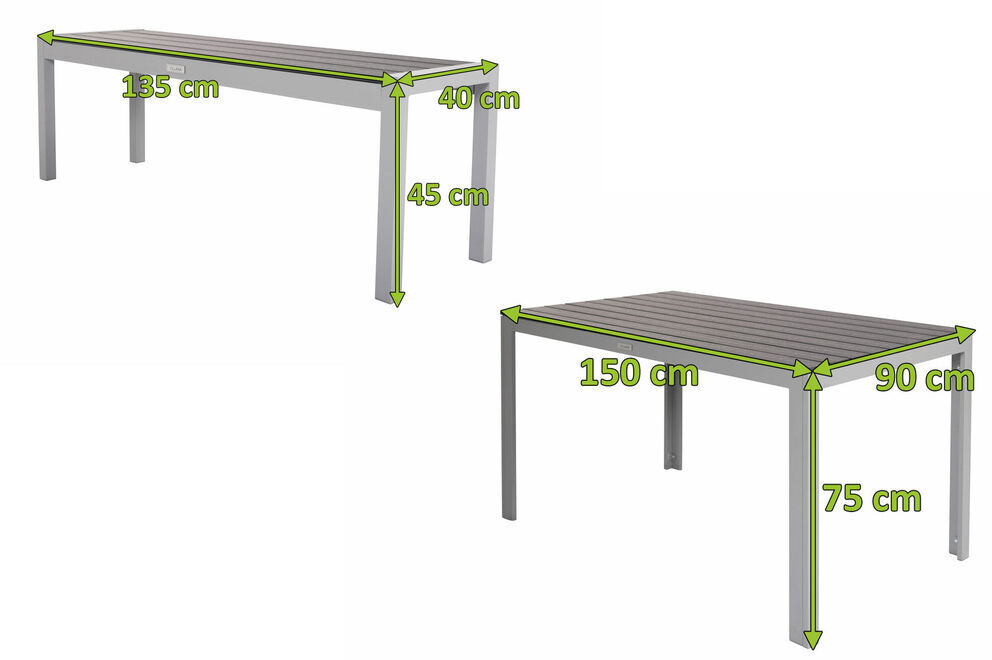 Die dazu passenden Bank aus dem identischen Material rundet das Gesamtpaket ab. Mit der jeweiligen Größe von ca. 135 x 40 x 45 cm haben Sie ausreichend Platz für jeweils bis zu 3 Personen. Auch bei den Bänken wurde das Gestell aus pulverbeschichtetem Aluminium gefertigt und gibt der Bank eine besonders hohe Stabilität und dank des Gewichtes von ca. 9,6 kg ist die Bank auch bis ca. 240 kg belastbar.