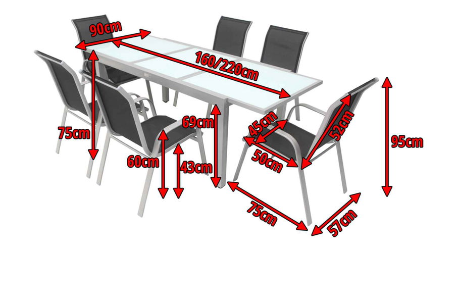 Diese Villana Esstischgruppe bietet Platz für sechs Personen - perfekt, um mit Freunden, Familie oder Nachbarn gemütlich im Garten oder auf der Terrasse zu sitzen. Die Gruppe setzt sich aus einem ausziehbaren Gartentisch und sechs Stapelstühlen zusammen, auf Wunsch können Sie diese Gruppe auch noch mit passenden Artikeln der Villana Serie erweitern. Der Tisch ist ca. 90 cm breit und ca. 75 cm hoch, im normalen Zustand hat er eine Länge von ca. 160 cm, so sind Sie sowohl für ein gemütliches Mittagessen mit der Familie als auch für die große Gartenparty bestens ausgerüstet. Das pulverbeschichtete Aluminiumgestell des Tisches kommt in einem attraktiven Silber daher, die ca. 5 mm dicke Tischplatte aus Sicherheitsglas ist weiß. Die Platte zum Erweitern des Tisches ist ebenfalls aus ca. 5 mm dickem Sicherheitsglas gefertigt und lässt sich durch einen Flügelmechanismus ausklappen. Man zieht einfach die beiden oberen Platten auseinander und klappt die darunterliegende Platte nach oben, und schon ist der Tisch auf ca. 220 cm erweitert. Der Stapelstuhl verfügt ebenfalls über ein silberfarben pulverbeschichtetes Aluminiumgestell, auf welches ein formstabiles Textil-Gewebe 2x1 (70% Polyvinylchlorid / 30% Polyester) in Schwarz aufgespannt wurde. Mit Maßen von ca. 75 x 57 x 95 cm und einem Gewicht von nur ca. 2,9 kg lässt sich der Stuhl ganz leicht hin und her stellen. Gleichzeitig bietet er die nötige Stabilität und dank der durchgehenden Sitz- und Rückenfläche einen angenehmen Sitzkomfort. Bei Nichtgebrauch lassen sich die Stühle beispielsweise in einem Gartenschuppen oder an einem anderen Ort gestapelt einlagern und nehmen so sehr wenig Platz ein. Mit einer Belastbarkeit von bis zu ca. 130 kg ist der praktische Sessel besonders robust und für erholsame Stunden in der Sonne einsatzbereit. Die Fußkappen der Möbel sind aus silbernem Kunststoff und schützen den Boden vor unschönen Kratzern beim Verrücken des Stuhles, die silbernen Schrauben aus galvanisiertem Stahl runden die Optik perfekt ab.