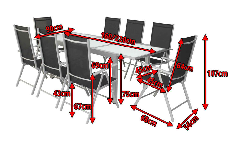 Diese Villana Garten-Essgruppe bietet Platz für acht Personen - perfekt, um mit Freunden, Familie oder Nachbarn gemütlich im Garten oder auf der Terrasse zu sitzen. Die Gruppe Garten-Essgruppezt sich aus einem ausziehbaren Gartentisch und acht Klappstühlen zusammen, auf Wunsch können Sie diese Gruppe auch noch mit passenden Artikeln der Villana Serie erweitern. Der Tisch ist ca. 90 cm breit und ca. 75 cm hoch, im normalen Zustand hat er eine Länge von ca. 160 cm, so sind Sie sowohl für ein gemütliches Mittagessen mit der Familie als auch für die große Gartenparty bestens ausgerüstet. Das pulverbeschichtete Aluminiumgestell des Tisches kommt in einem attraktiven Silber daher, die ca. 5 mm dicke Tischplatte aus Sicherheitsglas ist weiß. Die Platte zum Erweitern des Tisches ist ebenfalls aus ca. 5 mm dickem Sicherheitsglas gefertigt und lässt sich durch einen Flügelmechanismus ausklappen. Man zieht einfach die beiden oberen Platten auseinander und klappt die darunterliegende Platte nach oben, und schon ist der Tisch auf ca. 220 cm erweitert. Der Sessel verfügt ebenfalls über ein silberfarben pulverbeschichtetes Aluminiumgestell, auf welches ein formstabiles Textil-Gewebe 2x1 (70% Polyvinylchlorid / 30% Polyester) in Schwarz aufgespannt wurde. Mit Maßen von ca. 68 x 56 x 107 cm und einem Gewicht von nur ca. 3,6 kg lässt sich der Stuhl ganz leicht hin und her stellen. Gleichzeitig bietet er die nötige Stabilität und einen angenehmen Sitzkomfort, denn dieser Sessel ist wirklich ein Verwandlungskünstler. Er bietet seinem Nutzer acht verschiedene Einstellungen der Rückenlehne. So ist für jede Situation die richtige Liege- oder Sitzeinstellung dabei - ob beim Essen mit Freunden oder Familie, beim Lesen eines Buches oder beim Sonnenbaden. Bei Nichtgebrauch lassen sich die Stühle ganz leicht zusammenklappen und nehmen so sehr wenig Platz ein. Mit einer Belastbarkeit von bis zu ca. 120 kg ist der praktische Sessel besonders robust und für erholsame Stunden in der Sonne einsatzbereit. Die Fußkappen der Möbel sind aus silbernem Kunststoff und schützen den Boden vor unschönen Kratzern beim Verrücken des Stuhles, die silbernen Schrauben aus galvanisiertem Stahl runden die Optik perfekt ab.