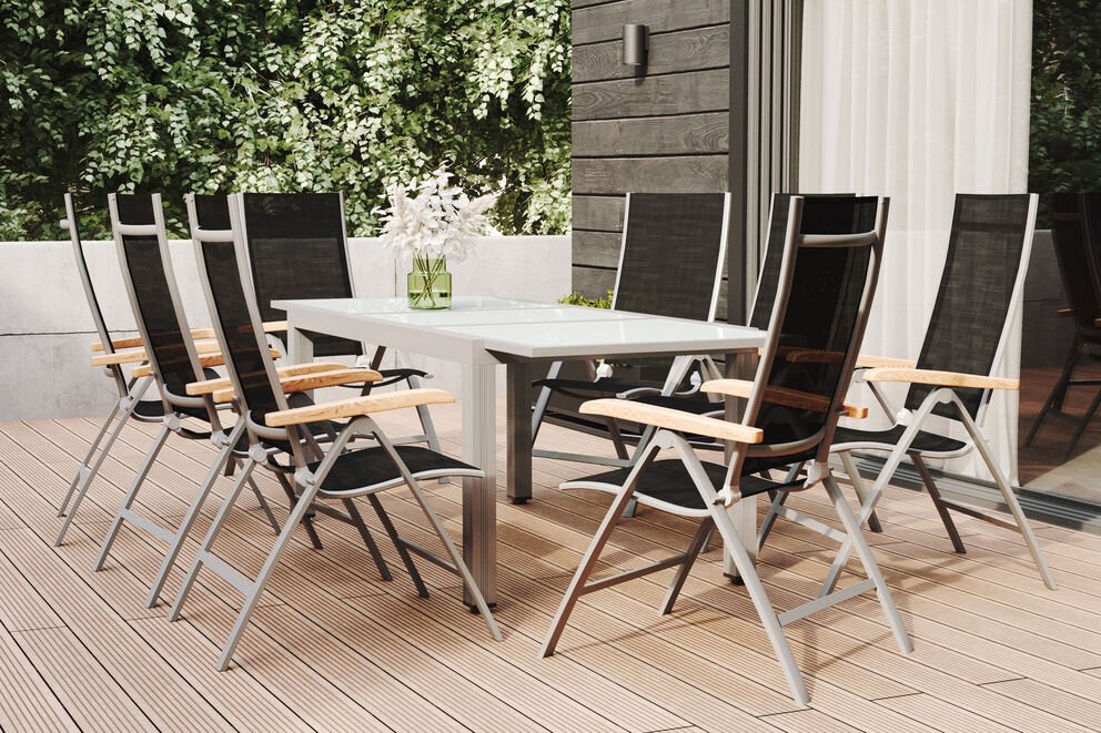 Die acht VILLANA Klappstühle in Silber und Schwarz ergänzen den Tisch ideal. Die Sessel sind aus leichtem, aber stabilem Aluminium gefertigt und ebenfalls pulverbeschichtet, um sie vor Korrosion zu schützen. Die Sitz- und Rückenflächen bestehen aus strapazierfähigem Textilene, das für seine UV-Beständigkeit und Atmungsaktivität bekannt ist. Die Armlehnen aus FSC-zertifiziertem Akazienholz setzen natürliche Akzente und sorgen für zusätzlichen Komfort. Jeder Sessel ist ca. 64 x 58 x 110 cm groß und die Rückenlehne lässt sich in neun verschiedenen Positionen verstellen, sodass Sie immer die perfekte Sitzposition finden können.