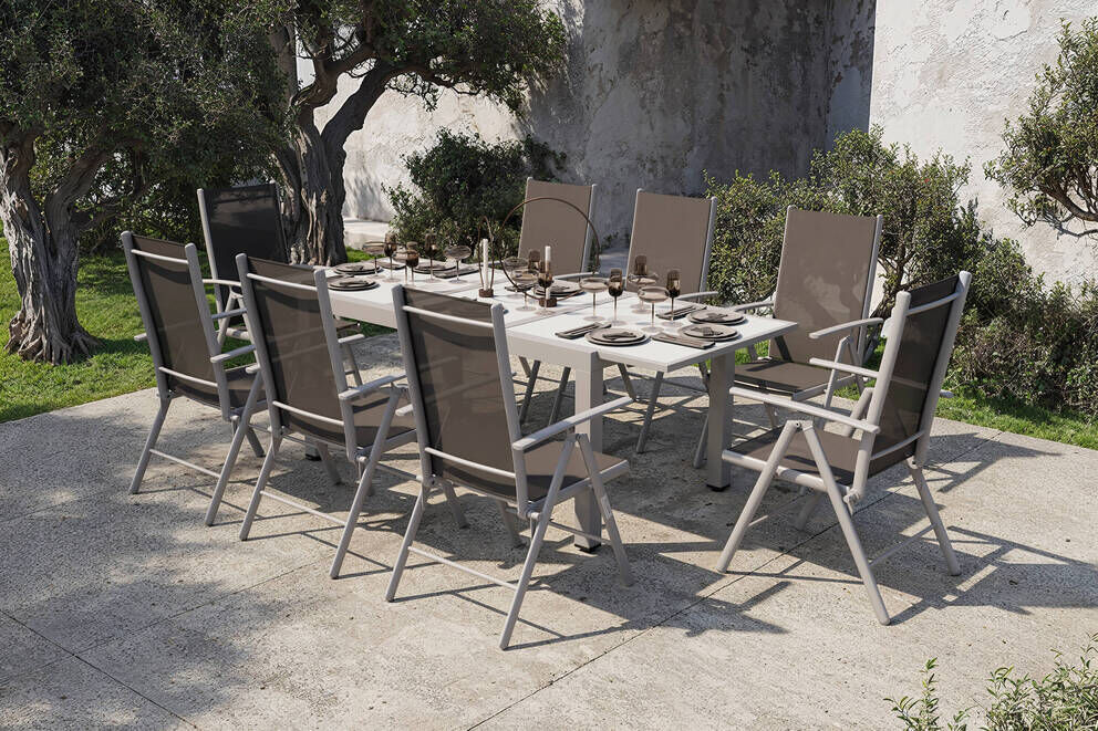 Diese Villana Garten-Essgruppe bietet Platz für acht Personen - perfekt, um mit Freunden, Familie oder Nachbarn gemütlich im Garten oder auf der Terrasse zu sitzen. Die Gruppe Garten-Essgruppezt sich aus einem ausziehbaren Gartentisch und acht Klappstühlen zusammen, auf Wunsch können Sie diese Gruppe auch noch mit passenden Artikeln der Villana Serie erweitern. Der Tisch ist ca. 90 cm breit und ca. 75 cm hoch, im normalen Zustand hat er eine Länge von ca. 160 cm, so sind Sie sowohl für ein gemütliches Mittagessen mit der Familie als auch für die große Gartenparty bestens ausgerüstet. Das pulverbeschichtete Aluminiumgestell des Tisches kommt in einem attraktiven Silber daher, die ca. 5 mm dicke Tischplatte aus Sicherheitsglas ist weiß. Die Platte zum Erweitern des Tisches ist ebenfalls aus ca. 5 mm dickem Sicherheitsglas gefertigt und lässt sich durch einen Flügelmechanismus ausklappen. Man zieht einfach die beiden oberen Platten auseinander und klappt die darunterliegende Platte nach oben, und schon ist der Tisch auf ca. 220 cm erweitert. Der Sessel verfügt ebenfalls über ein silberfarben pulverbeschichtetes Aluminiumgestell, auf welches ein formstabiles Textil-Gewebe 2x1 (70% Polyvinylchlorid / 30% Polyester) in Schwarz aufgespannt wurde. Mit Maßen von ca. 68 x 56 x 107 cm und einem Gewicht von nur ca. 3,6 kg lässt sich der Stuhl ganz leicht hin und her stellen. Gleichzeitig bietet er die nötige Stabilität und einen angenehmen Sitzkomfort, denn dieser Sessel ist wirklich ein Verwandlungskünstler. Er bietet seinem Nutzer acht verschiedene Einstellungen der Rückenlehne. So ist für jede Situation die richtige Liege- oder Sitzeinstellung dabei - ob beim Essen mit Freunden oder Familie, beim Lesen eines Buches oder beim Sonnenbaden. Bei Nichtgebrauch lassen sich die Stühle ganz leicht zusammenklappen und nehmen so sehr wenig Platz ein. Mit einer Belastbarkeit von bis zu ca. 120 kg ist der praktische Sessel besonders robust und für erholsame Stunden in der Sonne einsatzbereit. Die Fußkappen der Möbel sind aus silbernem Kunststoff und schützen den Boden vor unschönen Kratzern beim Verrücken des Stuhles, die silbernen Schrauben aus galvanisiertem Stahl runden die Optik perfekt ab.