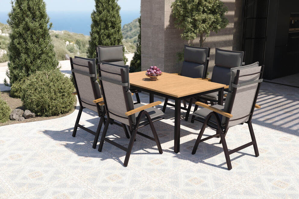 Das robuste Aluminiumgestell und die FSC®-zertifizierte Eukalyptusholz-Tischplatte sind langlebig, pflegeleicht und widerstandsfähig gegen Witterungseinflüsse, sodass Sie lange Freude an der Essgruppe haben. |
