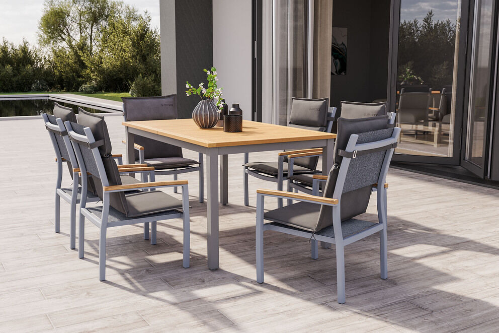 Die sechs dazugehörigen VILLANA Stapelstühle ergänzen das Set perfekt. Sie verfügen über ein stabiles Aluminiumgestell in Silber, Armlehnen aus natürlichem FSC®-Eukalyptusholz und sind mit strapazierfähigem Textilene-Gewebe bespannt, das besonders witterungsbeständig und pflegeleicht ist. Die Stühle sind stapelbar und mit integrierten Fußkappen ausgestattet, die den Boden schützen und ein Verrutschen verhindern. Die bequemen Maße mit einer Sitzbreite von ca. 56 cm und einer Sitzhöhe von ca. 46 cm sorgen für angenehmen Sitzkomfort auch bei längeren Sitzungen.