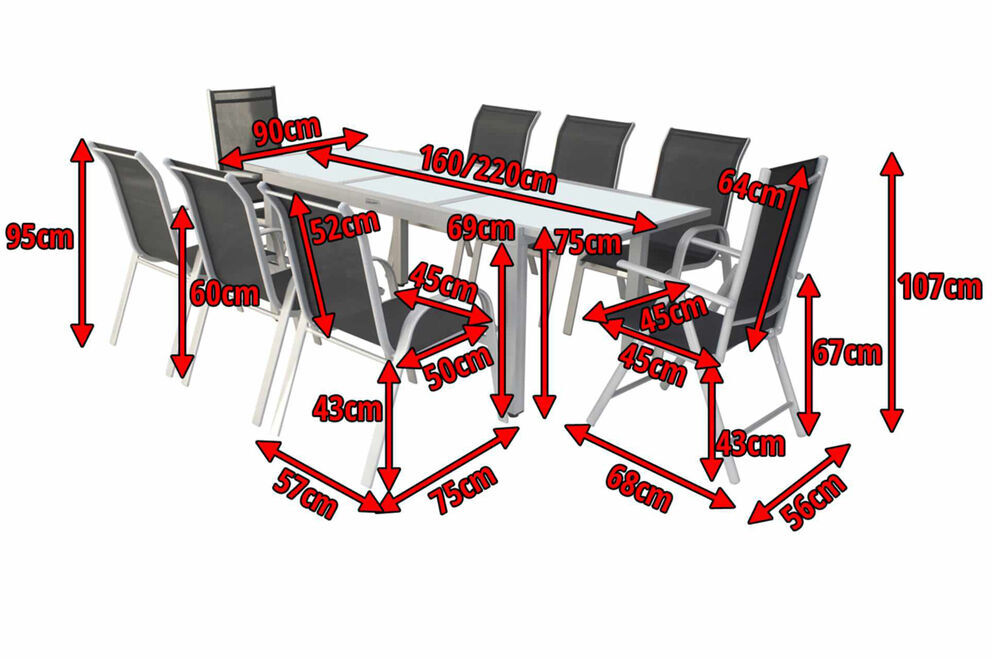 Diese Villana Esstischgruppe bietet Platz für acht Personen - perfekt, um mit Freunden, Familie oder Nachbarn gemütlich im Garten oder auf der Terrasse zu sitzen. Die Gruppe setzt sich aus einem ausziehbaren Gartentisch, sechs Stapelstühlen und zwei Multipositionssesseln zusammen, auf Wunsch können Sie diese Gruppe auch noch mit passenden Artikeln der Villana Serie erweitern. Der Tisch ist ca. 90 cm breit und ca. 75 cm hoch, im normalen Zustand hat er eine Länge von ca. 160 cm, so sind Sie sowohl für ein gemütliches Mittagessen mit der Familie als auch für die große Gartenparty bestens ausgerüstet. Das pulverbeschichtete Aluminiumgestell des Tisches kommt in einem attraktiven Silber daher, die ca. 5 mm dicke Tischplatte aus Sicherheitsglas ist weiß. Die Platte zum Erweitern des Tisches ist ebenfalls aus ca. 5 mm dickem Sicherheitsglas gefertigt und lässt sich durch einen Flügelmechanismus ausklappen. Man zieht einfach die beiden oberen Platten auseinander und klappt die darunterliegende Platte nach oben, und schon ist der Tisch auf ca. 220 cm erweitert. Die Stühle verfügt ebenfalls über ein silberfarben pulverbeschichtetes Aluminiumgestell, auf welches ein formstabiles Textil-Gewebe 2x1 (70% Polyvinylchlorid / 30% Polyester) in Schwarz aufgespannt wurde. Mit Maßen von ca. 68 x 56 x 107 cm und einem Gewicht von nur ca. 3,6 kg lässt sich der Multipositionssessel ganz leicht hin und her stellen. Die Stapelstühle passen dank der Maße von ca. 75 x 57 x 95 cm und einem Gewicht von nur ca. 2,9 kg perfekt zur Sitzgruppe. Alle Stühle bieten nicht nur die nötige Stabilität mit einer maximalen Belastbarkeit von ca. 120 kg sondern auch einen angenehmen Sitzkomfort, der Stapelstuhl dank der durchgehenden Rückenlehne und der Multipositionssessel als absoluter Verwandlungskünstler. Er bietet seinem Nutzer acht verschiedene Einstellungen der Rückenlehne. So ist für jede Situation die richtige Liege- oder Sitzeinstellung dabei - ob beim Essen mit Freunden oder Familie, beim Lesen eines Buches oder beim Sonnenbaden. Bei Nichtgebrauch lassen sich die Stühle ganz leicht zusammenklappen bzw. stapeln und nehmen so sehr wenig Platz ein. Die Fußkappen der Möbel sind aus silbernem Kunststoff und schützen den Boden vor unschönen Kratzern beim Verrücken des Stuhles, die silbernen Schrauben aus galvanisiertem Stahl runden die Optik perfekt ab.