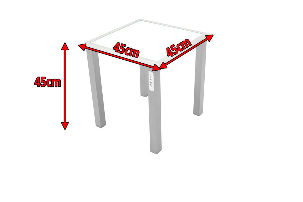Um genügend Ablagefläche zu bieten, wurde dieser Beistelltisch von Villana geschaffen. Zum Beispiel für ein Getränk auf der Sonnenliege, für die Zeitung oder ein gutes Buch, die Sonnen- oder Lesebrille oder etwas Leckeres zwischendurch. Mit diesem Tisch haben sie eine schöne Ergänzung Ihrer Möbel im Garten oder auf der Terrasse. Das pulverbeschichtete Aluminiumgestell des Tisches kommt in einem attraktiven Silber daher, die ca. 5 mm dicke Tischplatte aus Sicherheitsglas ist weiß. Die Fußkappen sind aus silbernem Kunststoff und schützen den Boden vor unschönen Kratzern beim Verrücken des Möbelstücks, die silbernen Schrauben aus galvanisiertem Stahl runden die Optik des Tisches perfekt ab.