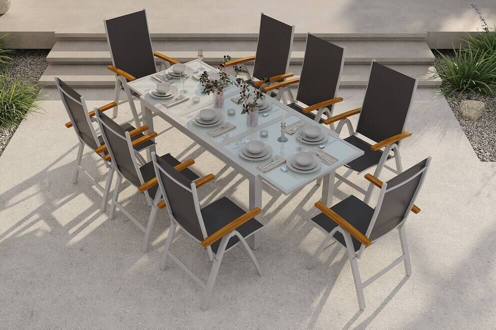 Besonders praktisch: Die Möbel sind witterungsbeständig und für den dauerhaften Einsatz im Freien konzipiert. Aluminium und Glas erfordern nur minimale Pflege, während die Holzarmlehnen durch gelegentliches Ölen ihren natürlichen Farbton behalten. Die integrierten Fußkappen schützen empfindliche Böden vor Kratzern und verbessern die Standfestigkeit. Durch den geringen Pflegeaufwand eignet sich die Essgruppe ideal für alle, die Wert auf Qualität, Komfort und modernes Design legen.