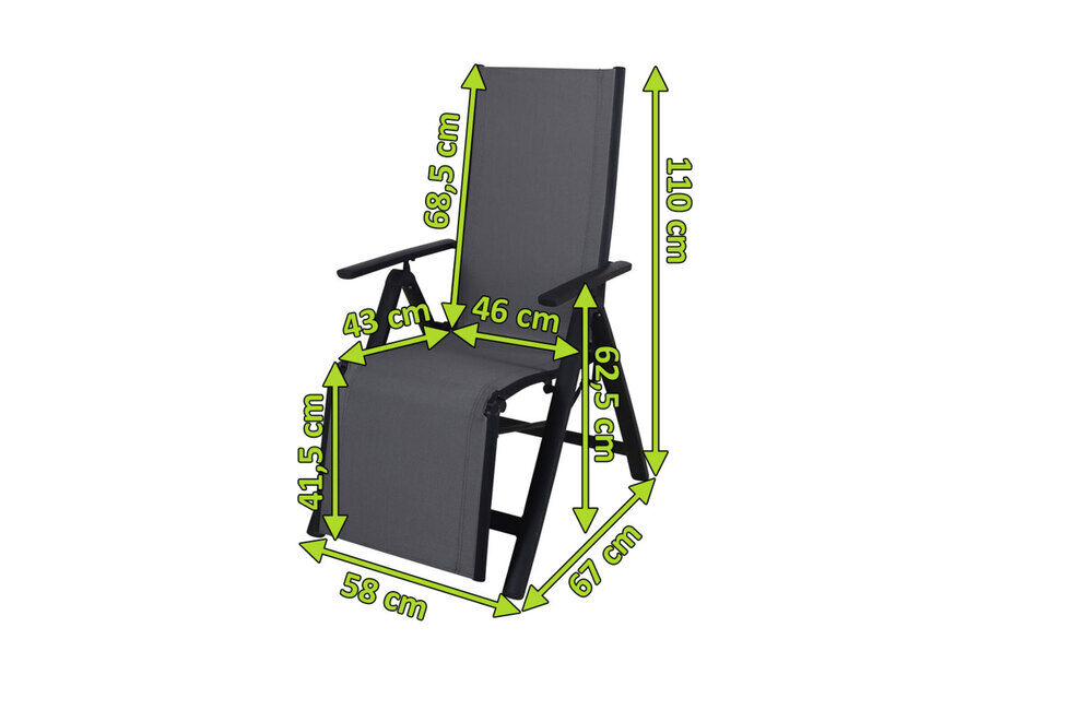 Der Relaxsessel verfügt über ein anthrazitfarbenes, pulverbeschichtetes Aluminiumgestell, auf welches ein formstabiles Textilene-Gewebe aus 70% Polyvinylchlorid (PVC) und 30% Polyester in grau gespannt wurde. Dadurch ist der Sessel sowohl wetterfest als auch pflegeleicht und sichert optimalen Komfort. Mit den Maßen von ca. 67 x 58 x 110 cm und einem Gewicht von ca. 5,8 kg lässt sich der Stuhl leicht hin und her stellen und ist so stets flexibel was seinen Einsatzort betrifft. Gleichzeitig können Sie den Stuhl bei Nichtgebrauch einfach zusammenklappen und platzsparend verstauen. Mit einer Belastbarkeit von bis zu ca. 120 kg ist der wandelbare Sessel robust und für erholsame Stunden in der Sonne einsatzbereit. Zudem schmeichelt der Stuhl durch seine Flexibilität. Mit Hilfe des Rastersystems in den Armlehnen ist er im Stande Ihnen 7 unterschiedliche Sitz- und Liegepositionen anzubieten. Zum weiteren Ausbau Ihrer Komfortzone wird mit dem Senken der Rückenlehne die integrierte Fußablage im gleichen Maße angehoben.