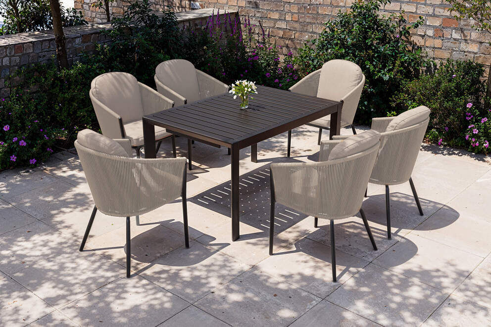 Die sechs Rope-Dining-Sessel bieten durch ihr anschmiegsames Geflecht und die ca. 5 cm starken Sitz- und Rückenkissen ein besonders angenehmes Sitzgefühl. Gleichzeitig sorgen luftdurchlässige Materialien für ein angenehm kühles Sitzklima an warmen Tagen. |