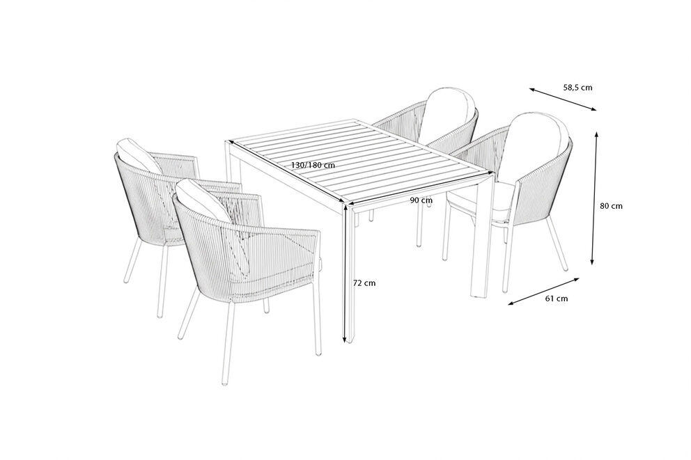 Ob für ein gemütliches Frühstück im Freien, ein stimmungsvolles Abendessen oder entspannte Gesprächsrunden: Die VILLANA Tareo Garten-Essgruppe schafft ein einladendes Ambiente und vereint dabei Komfort, Stil und Funktion in perfekter Balance. Die hochwertigen Materialien wie Aluminium und Rope-Geflecht sind pflegeleicht, robust und bestens für wechselnde Witterungsbedingungen geeignet. Fußkappen schützen sowohl Bodenflächen als auch das Mobiliar selbst und ermöglichen einen sicheren Stand auf verschiedenen Untergründen.