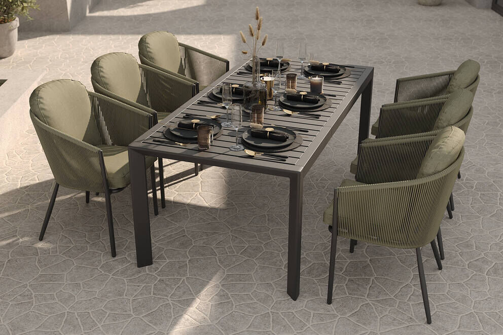 Die sechs Dining-Sessel des Modells Tareo ergänzen den Tisch perfekt. Das pulverbeschichtete Aluminiumgestell in Anthrazit überzeugt mit hoher Widerstandsfähigkeit, während das seitliche Rope-Geflecht nicht nur optisch begeistert, sondern auch eine angenehme Flexibilität bietet. Die ergonomisch geformten Rückenpartien und die inklusiven Sitz- und Rückenkissen sorgen für komfortables Sitzen über viele Stunden hinweg. Die Polster bestehen aus strapazierfähigem Polyester, sind ca. 5 cm stark und lassen sich dank Reißverschluss abnehmen und waschen. Das Zusammenspiel aus stabilem Gestell und flexibler Bespannung schafft einen ausgewogenen Mix aus Komfort und Langlebigkeit.