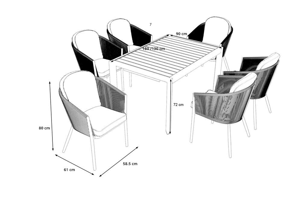 Mit ihren kompakten Maßen von ca. 58,5 x 61 x 80 cm lassen sich die Sessel mühelos handhaben und zudem platzsparend lagern, wenn Sie sie nicht benötigen. Die Kombination aus Aluminium und Rope-Geflecht bietet hervorragende Materialeigenschaften: Das Gestell ist korrosionsbeständig, langlebig und leicht, während das Rope pflegeleicht und strapazierfähig ist. Dadurch bleibt die Essgruppe auch bei häufiger Nutzung zuverlässig in Form.