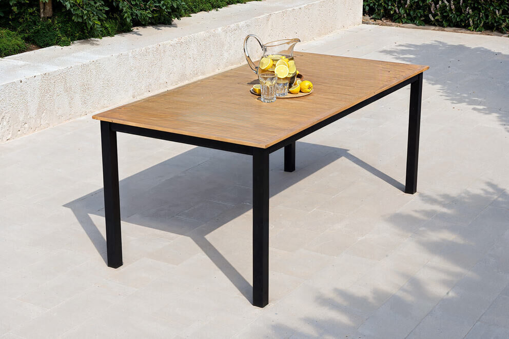 Der Rahmen des Esstisches besteht aus robustem, beschichtetem Aluminium, das nicht nur für Stabilität sorgt, sondern auch Korrosionsbeständigkeit garantiert. Die schwarze Beschichtung bietet nicht nur einen ansprechenden Look, sondern schützt auch effektiv vor den Einflüssen von Wind und Wetter. Die ca. 180 x 90 cm große Tischplatte ist aus hochwertigem FSC®-Eukalyptusholz gefertigt und verleiht dem Tisch einen natürlichen und warmen Charakter. Dank der natürlichen Holzmaserung wird jedes Möbelstück zu einem Unikat.