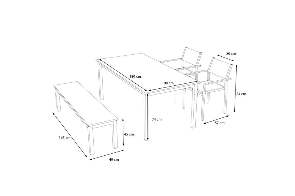 Sowohl die Bank als auch die Sessel verfügen über pulverbeschichtete Aluminiumrahmen. Dieses Material ist rostfrei, wetterbeständig und lässt sich leicht pflegen. Die robuste Konstruktion sorgt dafür, dass die Möbel auch bei häufiger Nutzung ihre Form und Stabilität behalten. Da alle Komponenten darauf ausgelegt sind, dauerhaft im Außenbereich genutzt zu werden, eignet sich die Essgruppe hervorragend für Terrassen, Gärten und andere Außenflächen.