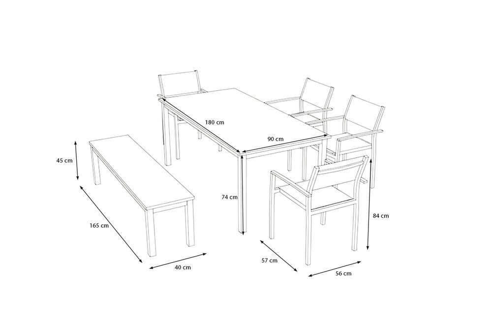 Sowohl die Bank als auch die Sessel verfügen über pulverbeschichtete Aluminiumrahmen. Dieses Material ist rostfrei, wetterbeständig und lässt sich leicht pflegen. Die robuste Konstruktion sorgt dafür, dass die Möbel auch bei häufiger Nutzung ihre Form und Stabilität behalten. Da alle Komponenten darauf ausgelegt sind, dauerhaft im Außenbereich genutzt zu werden, eignet sich die Essgruppe hervorragend für Terrassen, Gärten und andere Außenflächen.