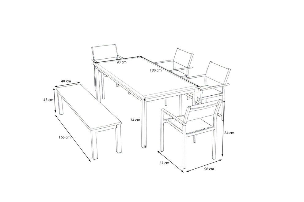 Aluminium, Eukalyptusholz und Textilene bilden eine langlebige, stabile und pflegeleichte Kombination. Die Gestelle sind korrosionsbeständig, die Holzflächen aus FSC®-Eukalyptus verleihen Tisch, Bank und Stühlen eine warme Optik, und das Textilene sorgt für komfortables, luftdurchlässiges Sitzen. Ideal für dauerhafte Nutzung im Außenbereich. |