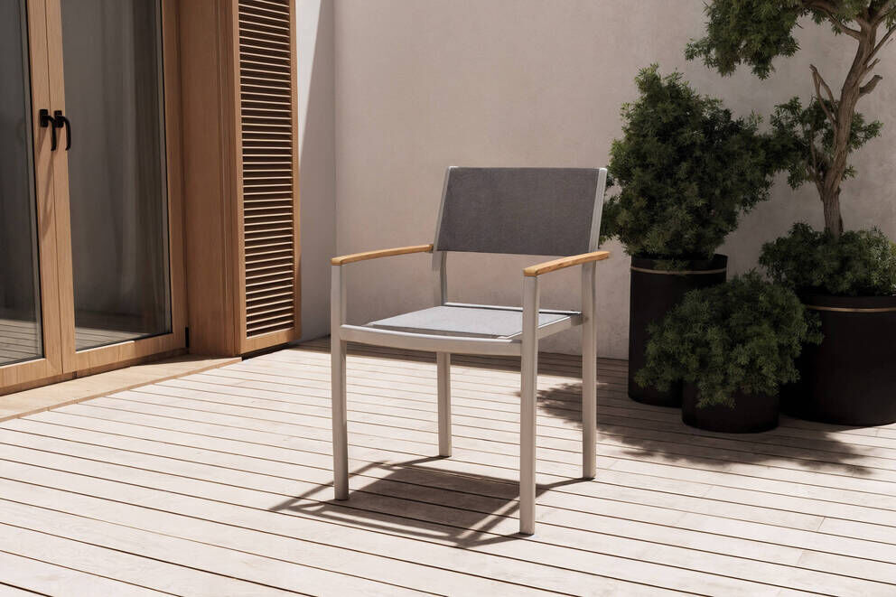 Das Gestell aus Aluminium sorgt für hervorragende Stabilität und Witterungsbeständigkeit, sodass der Stuhl auch bei wechselnden Wetterbedingungen im Freien genutzt werden kann. Die Armlehnen aus edlem FSC®-Eukalyptusholz setzen natürliche Akzente und verleihen dem Stuhl eine warme, einladende Ausstrahlung. Das Textilene-Material in silber/grau ist nicht nur hautfreundlich, sondern auch pflegeleicht und strapazierfähig – ideal für den täglichen Gebrauch.