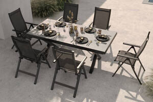 OUTFLEXX Serro Garten-Essgruppe, anthrazit matt/schwarz/grau, Aluminium/Steinimitat/Textilene, 200/260 x 100 cm, ausziehbar, 6 Klappstühle