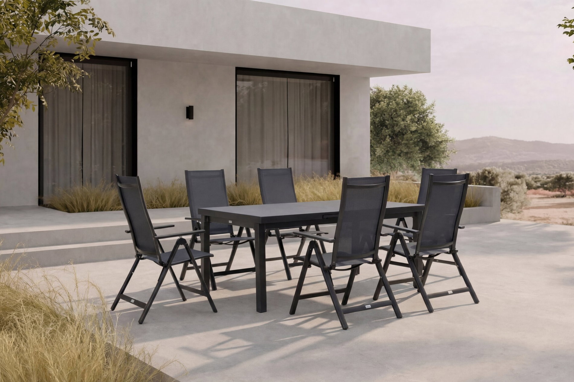 OUTFLEXX Premium Garten-Essgruppe, anthrazit/grau, Alu/Textilene, Ausziehtisch 180/240x100cm, 6 Klappstühle