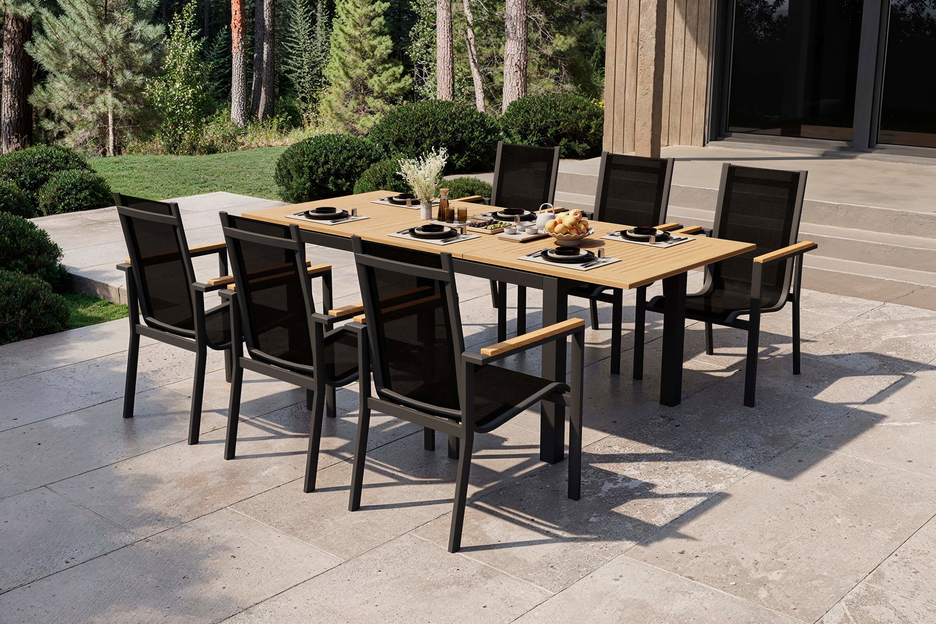 OUTFLEXX Garten-Essgruppe, anthrazit matt, Alu/Teak/Textilene, Tisch 150/210 x 90 cm, 6 Stapelsessel