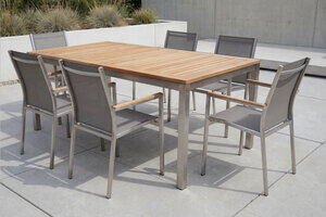 STERN Cardiff Garten-Essgruppe, silber/taupe, Edelstahl/Teak, Tisch 180/240 x 100 cm, 6 Stapelsessel, FSC®-zertifiziertes Produkt