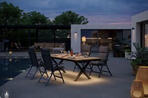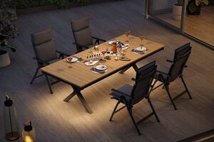 OUTFLEXX Luminara Garten-Essgruppe mit LED-Beleuchtung, anthrazit matt/natur, Aluminium/Textilen/Holzimitat, Tisch 240 x 100 cm, 4 Klappstühle inkl. 4 Auflagen