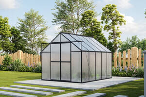 OUTFLEXX Verde Gewächshaus, schwarzer Rahmen, Aluminium/Polycarbonat, 310 x 244 x 230 cm, pulverbeschichtet, UV-geschützt, mit Schiebetür und 2 Fenstern