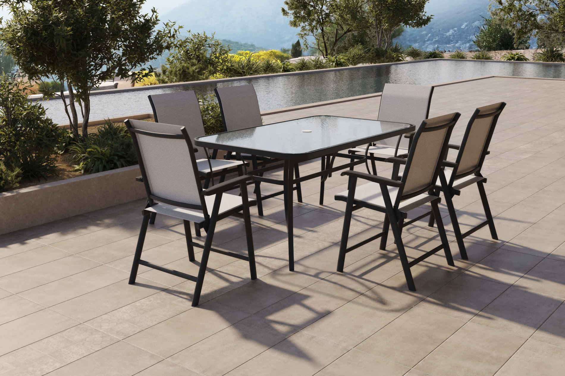 VILLANA Garten-Essgruppe mit 6 Klappstühlen, schwarz, Stahl/Textilene, Esstisch 150 x 90 cm