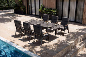 OUTFLEXX Premium Garten-Essgruppe, anthrazit matt, Aluminium/Polyester/Spraystone/Teak, 160/260 x 100 cm, 6 Stapelsessel