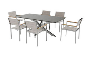 OUTFLEXX Garten-Essgruppe, silber/taupe, Edelstahl/Granit/Textil, 200x100 cm, 6 Stühle, padded, Armlehnen aus Teak