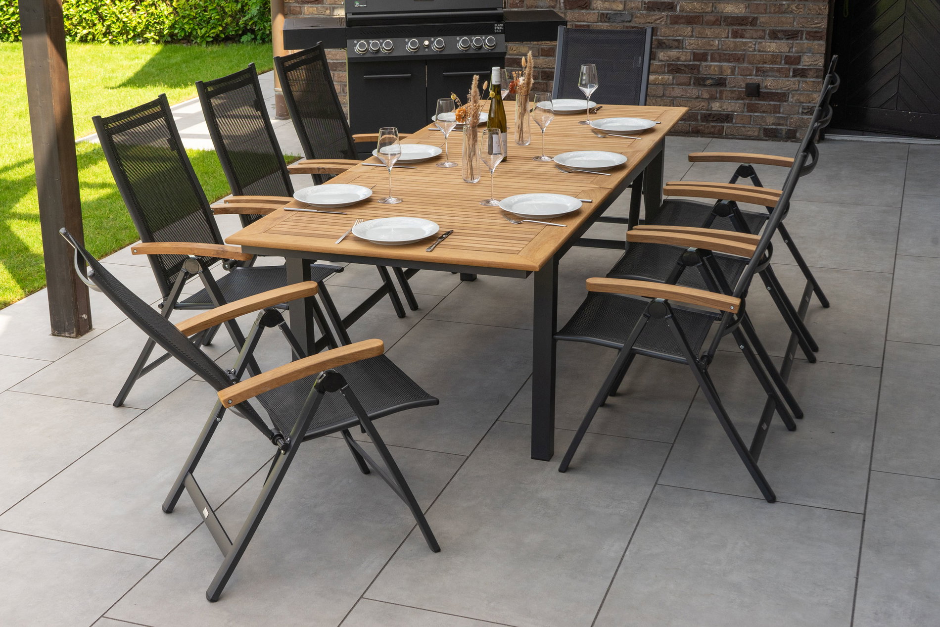 OUTFLEXX Garten-Essgruppe, OUTFLEXX® anthrazit matt, Alu / Teak / Textil, Tisch 180/240x100cm, 8 Klappstühle