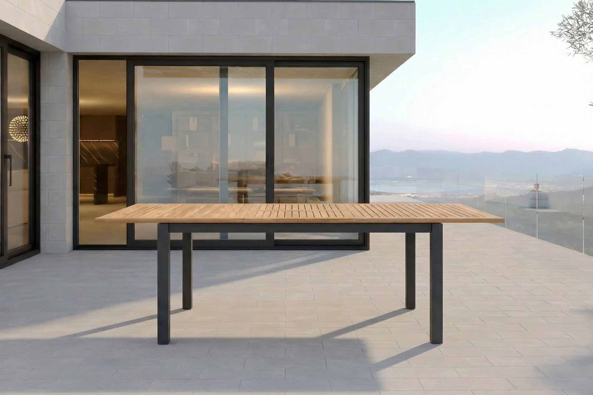 OUTFLEXX Premium Ausziehtisch, anthrazit matt, Alu/Teak, 150/210 x 90 cm, Synchronauszug mit Butterfly-Funktion