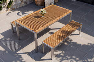 OUTFLEXX Falun Garten-Essgruppe, braun/silber, Edelstahl/Teakholz, 180 x 90 cm Tisch und 2 Bänke 160 x 38 cm