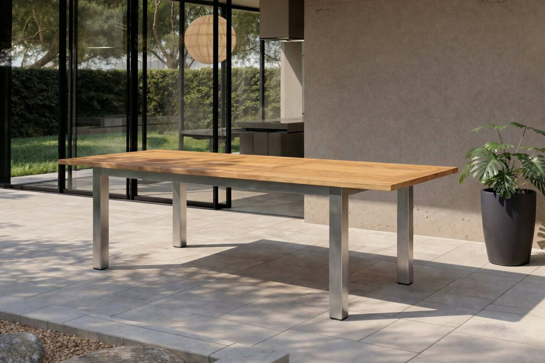 OUTFLEXX Ausziehtisch, Edelstahl/recyceltes Teak, 200/260x100cm, rustikal gebürstet, FSC®-zertifiziertes Produkt