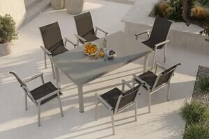 KETTLER BasicPlus Pro Garten-Essgruppe, silber/anthrazit, Alu/Textilene, ausziehbarer Tisch 180/240 x 100 cm, 6 Stapelsessel