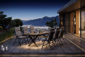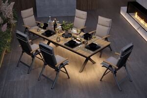OUTFLEXX Luminara Garten-Essgruppe mit LED-Beleuchtung, anthrazit matt/natur, Aluminium/Textilen/Holzimitat, Tisch 240 x 100 cm, 6 Klappstühle inkl. 6 Auflagen