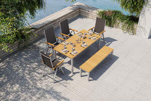 VILLANA Tasmania Garten-Essgruppe mit Bank und 4 Klappstühlen, silber/natur, Aluminium/Eukalyptus, Tisch 180 x 90 cm, FSC®-zertifiziertes Produkt