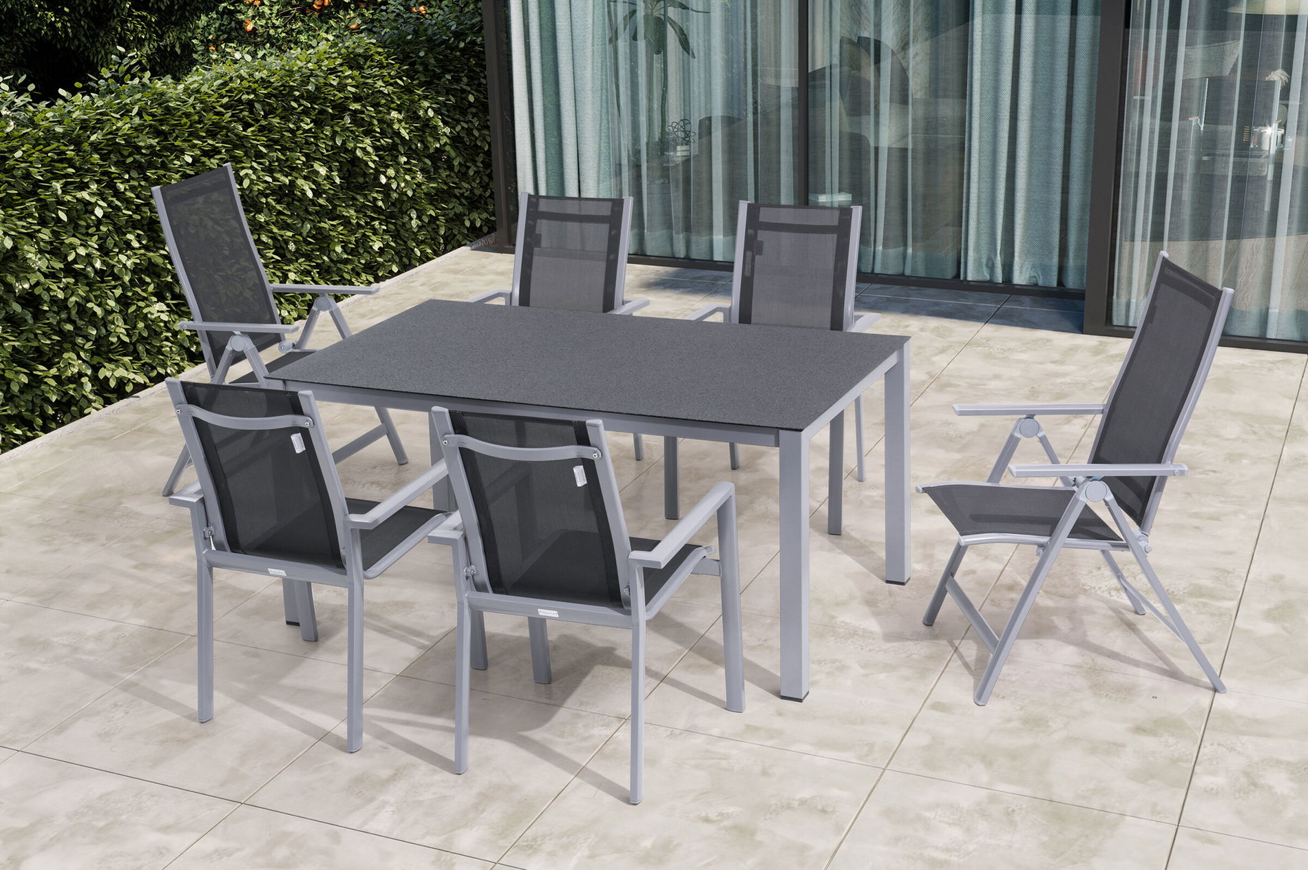 OUTFLEXX Garten-Essgruppe, silber/anthrazit, Alu/Spraystone/Textilen, 160 x 95 cm, 4 Stapelsessel, 2 Klappstühle