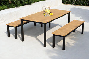 VILLANA Garten-Essgruppe, naturbelassen/anthrazit, Alu/Eukalyptus, Tisch 180 x 90 cm, 2 Gartenbänke, FSC®-zertifiziertes Produkt