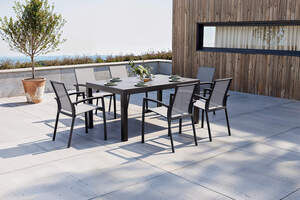 OUTFLEXX Premium Garten-Essgruppe, anthrazit matt/anthrazit, Aluminium/Spraystone/Ranotex, Tisch 160/260 x 100 cm, 6 stapelbare Sessel