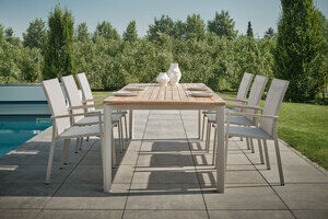 STERN NEW LEVANTO/PENTA Garten-Essgruppe, greige/Sesam, Aluminium/Textilen/Teak, Tisch 220 x 100 cm, 6 Stapelstühle