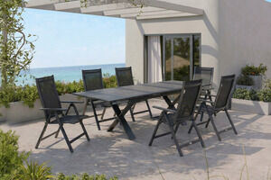 OUTFLEXX Garten-Essgruppe, OUTFLEXX® anthrazit matt, Alu / Spraystone / Textil, Tisch 180/280x100cm, 6 Klappstühle